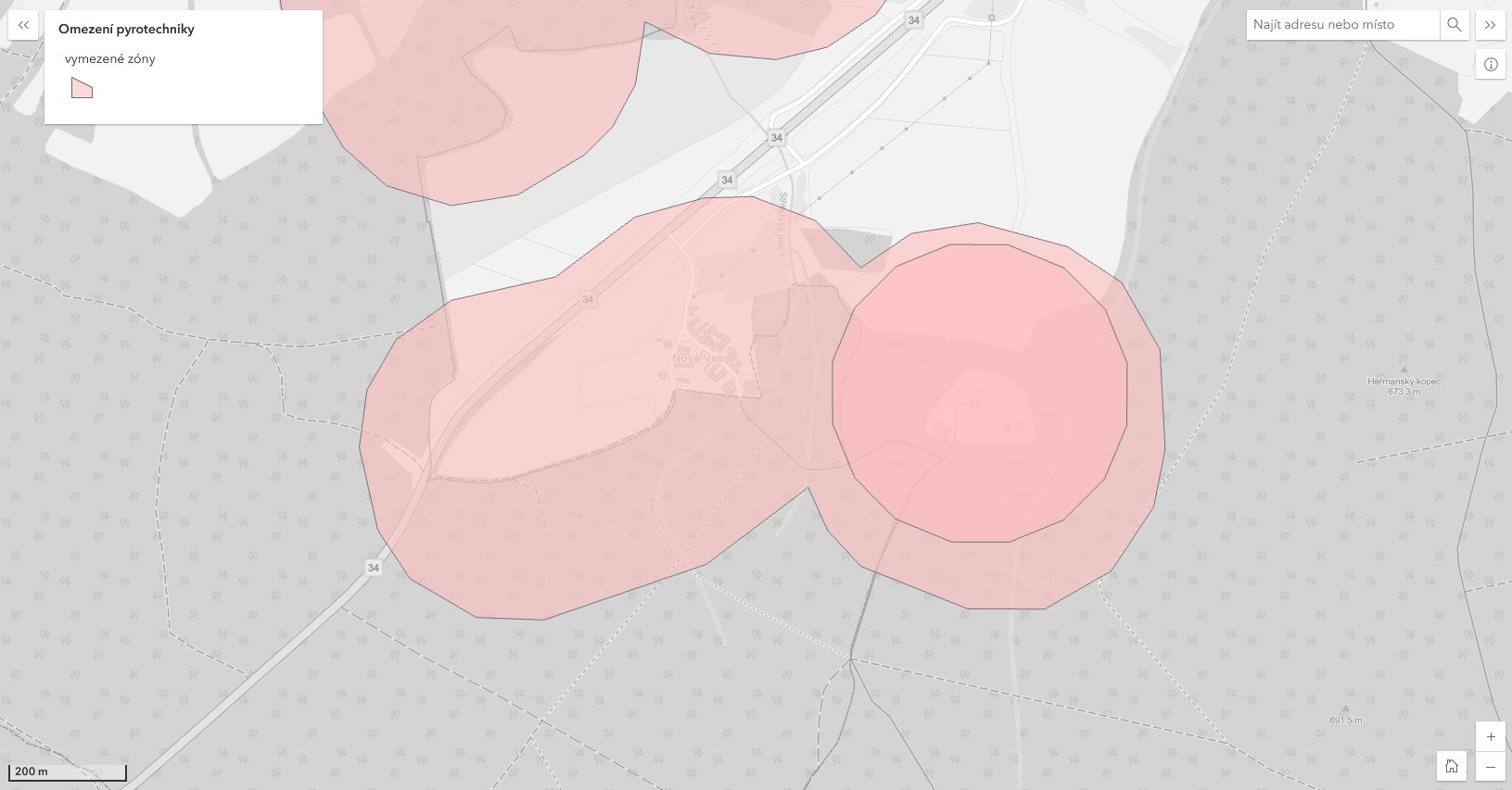 Zóny zákazu pyrotechniky v Božejově a Nové Vsi si můžete prohlédnout i na následujících fotografiích pořízených ze zmiňované mapy.
